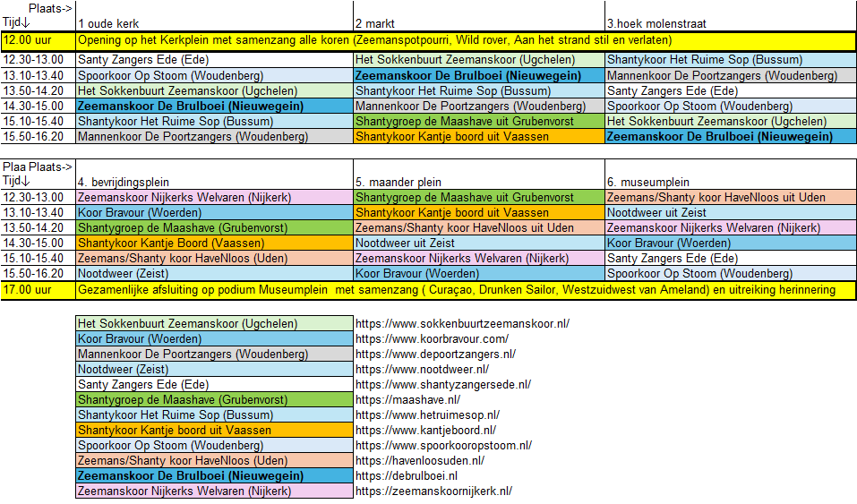 Ieder koor treedt 3 x een half uur op. De podia van ons blok van drie liggen dicht bij elkaar. Steeds ongeveer 2 tot 3 minuten lopen. Alleen het Museumplein is iets verder lopen. Ongeveer 6 minuten vanaf de Molenstraat.